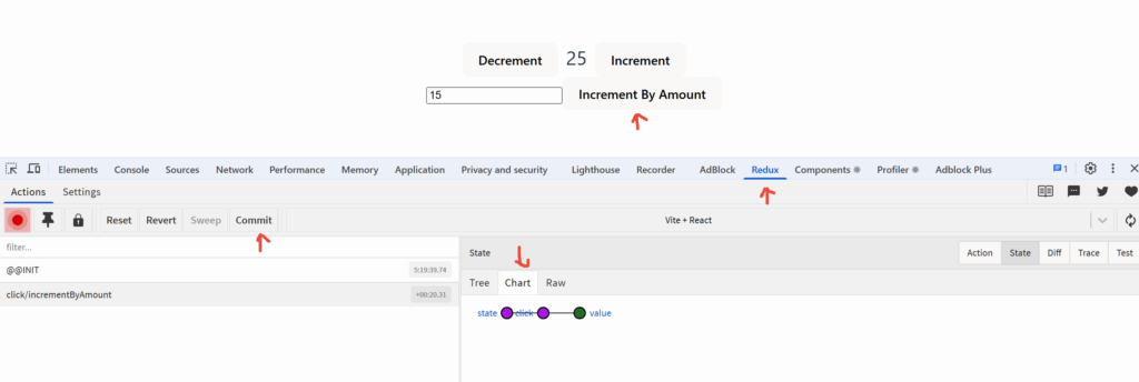 Aşağıda görüldüğü gibi redux yapısı kullanılarak sayı artırıp azaltabiliyoruz ve Redux uzantısı sayesinde de detaylarını takip edebiliriz.