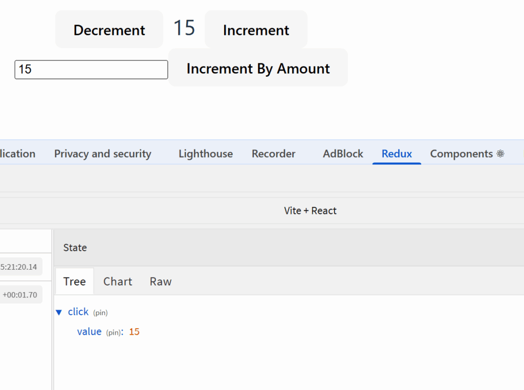 import { useDispatch, useSelector } from “react-redux”; import { decrement, increment, selectCount,incrementByAmount } from “./counterSlice”; import { useState } from “react”; export default function Counter() { const [amount,setAmount] = useState(0); const value = useSelector(selectCount); const dispatch = useDispatch(); return ( <> <br></br> <button onClick={() => dispatch(decrement())}>Decrement</button> <span className=“text”>{value}</span> <button onClick={() => dispatch(increment())}>Increment</button> <br></br> <input value={amount} onChange = {(e) => setAmount(e.target.value)}></input> <button onClick={() => dispatch(incrementByAmount({val:parseInt(amount)}))}>Increment By Amount</button> </> ); } |