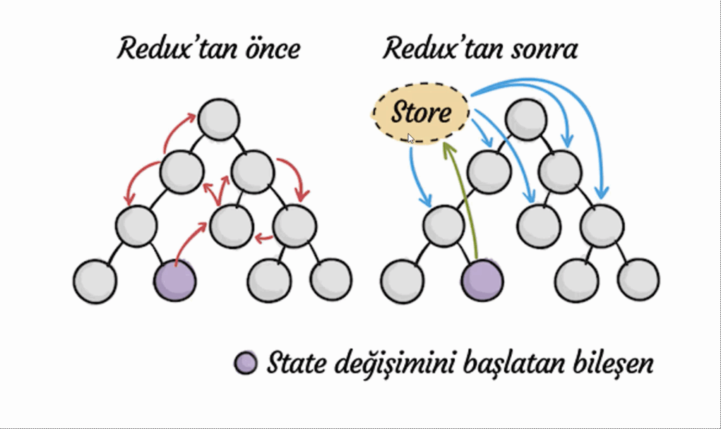 Aşağıdaki resimde olduğu gibi normal React yapısında bir methoda ihtiyaç varsa sürekli propslarla taşımamız gerekiyor. Buda zor ve meşakkatli bir iş oluyor. Redux ile herhangi bir katmandaki herhangi bir şeyi props geçmeden direckt alabilirsin.