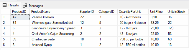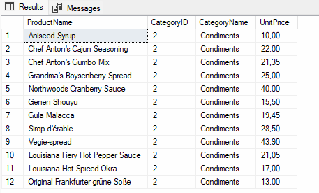 SELECT ProductName,P.CategoryID, CategoryName, UnitPrice FROM Products P LEFT JOIN Categories C ON P.CategoryID = C.CategoryID WHERE UnitPrice BETWEEN 6.00 AND 100.00 AND C.CategoryName = ‘Condiments’; |