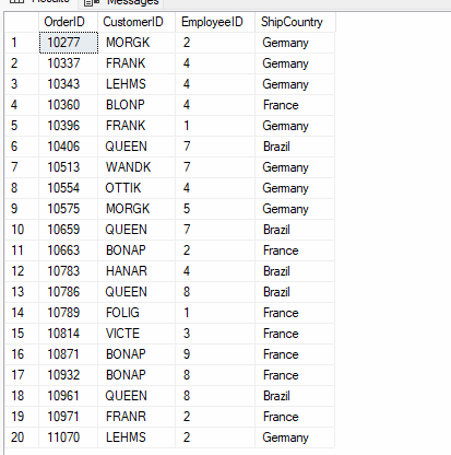 SELECT O.OrderID, O.CustomerID, O.EmployeeID,O.ShipCountry FROM Orders O RIGHT JOIN Customers C ON O.CustomerID = C.CustomerID RIGHT JOIN Employees E ON O.EmployeeID = E.EmployeeID WHERE O.Freight BETWEEN 100.00 AND 140.51 AND O.ShipCountry IN (‘Germany’,‘Brazil’,‘France’); |