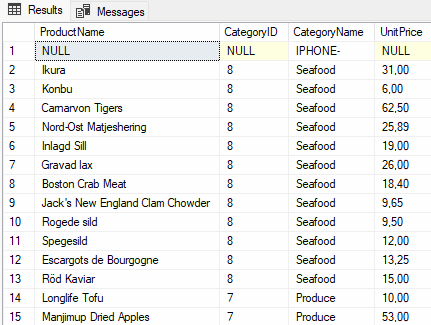 SELECT * FROM Products P INNER JOIN Categories C ON P.CategoryID = C.CategoryID WHERE P.ProductName like ‘%Se%’ AND P.UnitPrice <> 8.50 ORDER BY P.ProductName DESC |